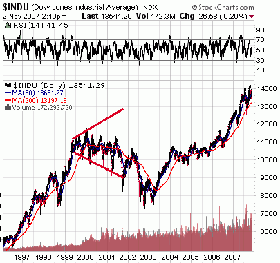 On the technical side, reverse triangles or “megaphones” as they are often called usually announce a coming breakdown. In the latter half of 2007, the Dow has traced out a picture perfect example of one of those.